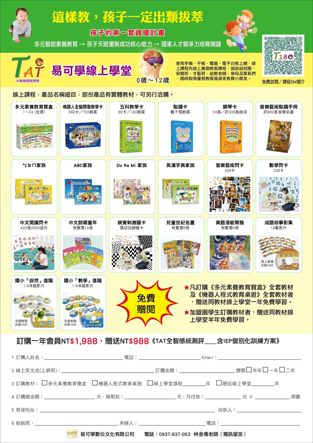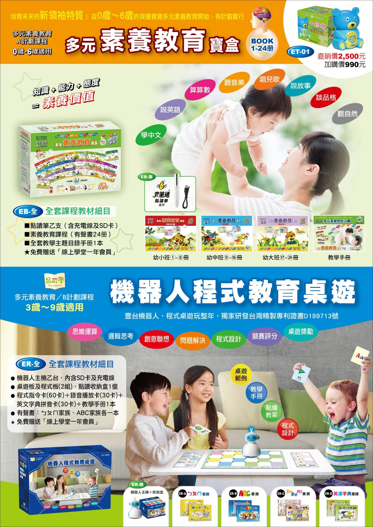 最輕鬆的資優計畫 >>> 最多元的教案主題 >>> 最簡明的教學內容 >>> 最省錢的教育投資 >>> 最科學的教育工具 >>> 最有效的教學方法 >>> 易可學學堂 歡迎試聽 【聯絡我們】 點擊下方 、名稱,進入閱覽 EB多元素養教育寶盒、ER機器人程式教育桌遊 TAT易可學線上學堂訂閱 ET多元素養教育寶盒 ER機器人桌遊課程 寶寶的資優A+計畫 資優計畫__適性課程 ET-03教學卡課程 ET-04點讀卡課程 ET-05鋼琴卡課程 ET-06符號卡課程 TPR幼童美語潛能 國小金頭腦系列