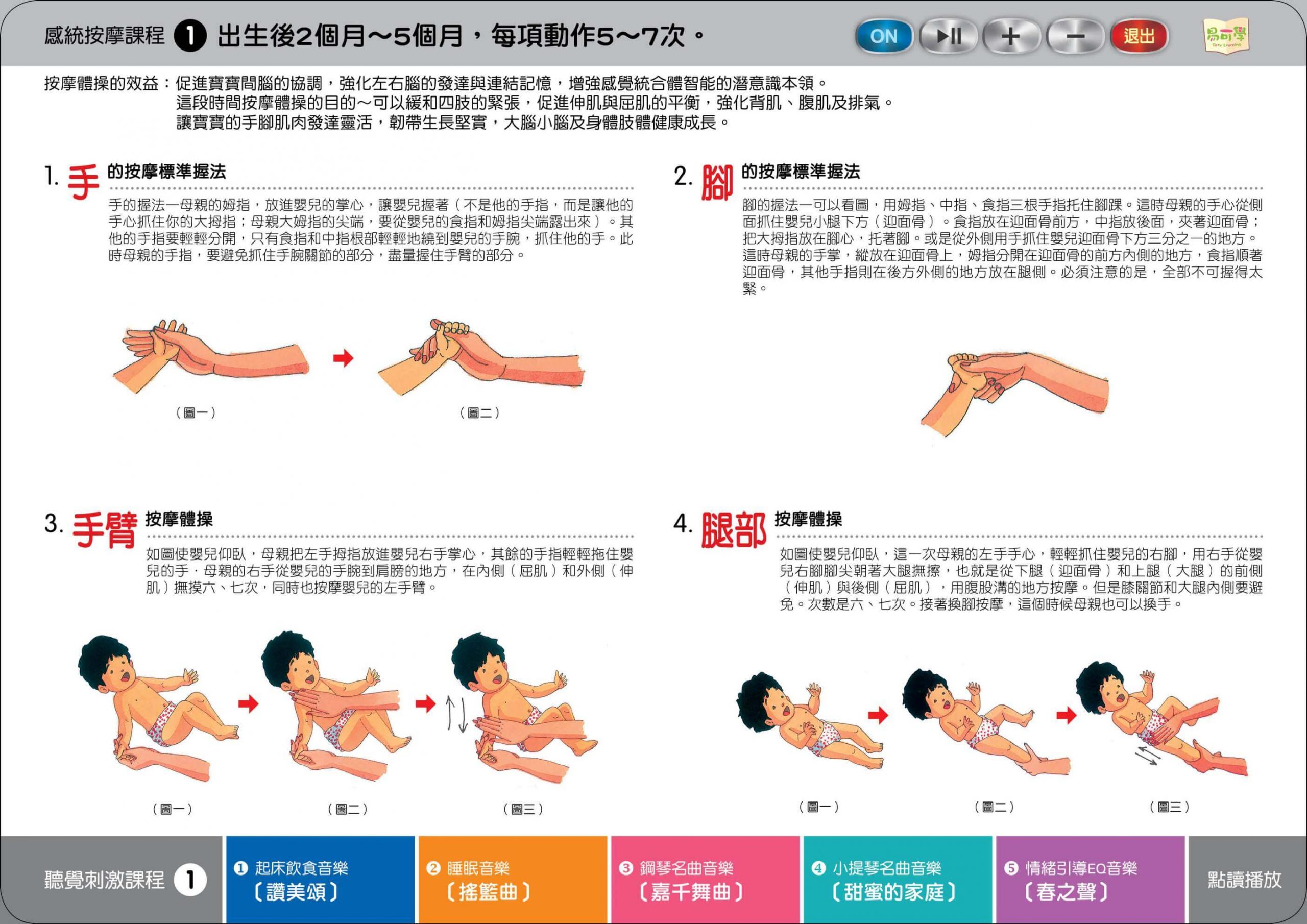 最輕鬆的資優計畫 >>> 最多元的教案主題 >>> 最簡明的教學內容 >>> 最省錢的教育投資 >>> 最科學的教育工具 >>> 最有效的教學方法 >>> 【感覺刺激課程】嬰幼兒按摩與體操~歡迎試聽 點擊下方 、名稱,進入閱覽 感統按摩課程1:出生後2個月~5個月(圖片點讀) 熱點顯示 / 隱藏 音訊_手、腳的按摩標準法 https://tat180.com/wp-content/uploads/2021/01/感統按摩課程B_1.mp3 音訊_手臂 按摩體操 https://tat180.com/wp-content/uploads/2021/01/感統按摩課程B_1_2.mp3 https://tat180.com/wp-content/uploads/2021/06/感統按摩課程B_1_2_2.mp3 音訊_腿部 按摩體操 https://tat180.com/wp-content/uploads/2021/01/感統按摩課程B_1_3.mp3 https://tat180.com/wp-content/uploads/2021/06/感統按摩課程B_1_3_2.mp3 音訊_起床飲食音樂~讚美頌 https://tat180.com/wp-content/uploads/2020/12/ET0401_129.讚美頌.mp3 音訊_睡眠音樂~搖籃曲 https://tat180.com/wp-content/uploads/2020/12/ET0401_3_201.搖籃曲.mp3 音訊_鋼琴名曲~嘉禾舞曲 https://tat180.com/wp-content/uploads/2020/12/ET0401_3_104.嘉禾舞曲.mp3 音訊_小提琴名曲~甜蜜的家庭 https://tat180.com/wp-content/uploads/2020/12/ET0401_224.甜蜜的家庭變奏曲.mp3 音訊_EQ音樂~春之頌 https://tat180.com/wp-content/uploads/2020/12/ET040401M01804.春之頌.mp3 視訊_法國黎兒舒嬰兒按摩 視訊_嬰兒按摩教學 視訊_嬰兒按摩教學影片(嬌生嬰兒) 視訊_媽咪充滿愛的撫觸 (嬌生嬰兒) 視訊_Bathing & Massage Benefits 視訊_CH7嬰兒按摩示範影片