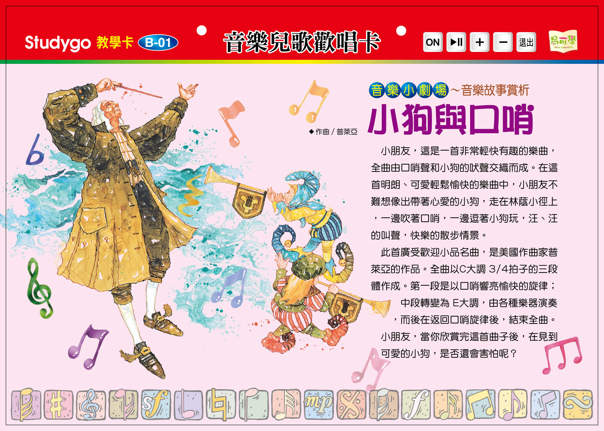 最輕鬆的資優計畫 >>> 最多元的教案主題 >>> 最簡明的教學內容 >>> 最省錢的教育投資 >>> 最科學的教育工具 >>> 最有效的教學方法 >>> 【ET03教學卡】音樂兒歌歡唱卡~歡迎試聽 點擊下方 、名稱,進入閱覽 B01_音樂小劇場:小狗與口哨 熱點顯示 / 隱藏 https://tat180.com/wp-content/uploads/2020/10/音樂劇場1-1.mp3 B01_兒歌歡唱:只要我長大、大頭歌(圖片點讀) 熱點顯示 / 隱藏 只要我長大 https://tat180.com/wp-content/uploads/2020/10/音樂劇場1_2.mp3 大頭歌 https://tat180.com/wp-content/uploads/2020/10/音樂劇場1-3.mp3