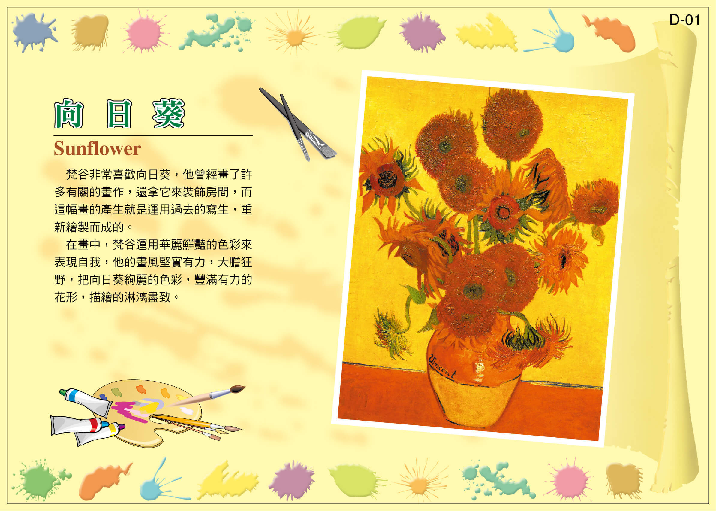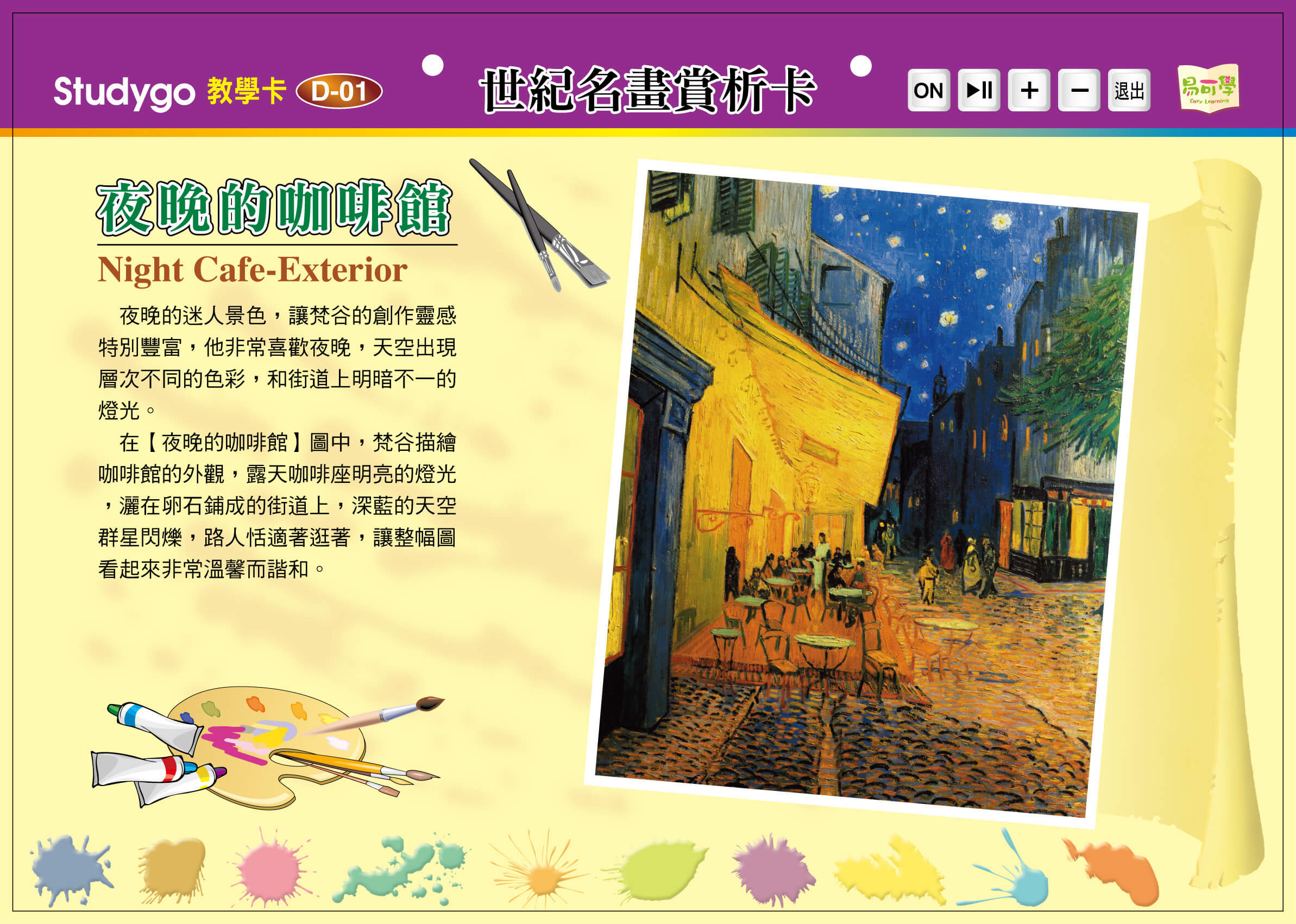 最輕鬆的資優計畫 >>> 最多元的教案主題 >>> 最簡明的教學內容 >>> 最省錢的教育投資 >>> 最科學的教育工具 >>> 最有效的教學方法 >>> 【ET03教學卡】世紀名畫賞析卡~歡迎試聽 點擊下方 、名稱,進入閱覽 D01-1:夜晚的咖啡館 熱點顯示 / 隱藏 https://tat180.com/wp-content/uploads/2020/10/世紀名畫1-1.mp3 D01-2:向日葵 熱點顯示 / 隱藏 https://tat180.com/wp-content/uploads/2020/10/世紀名畫1-2.mp3