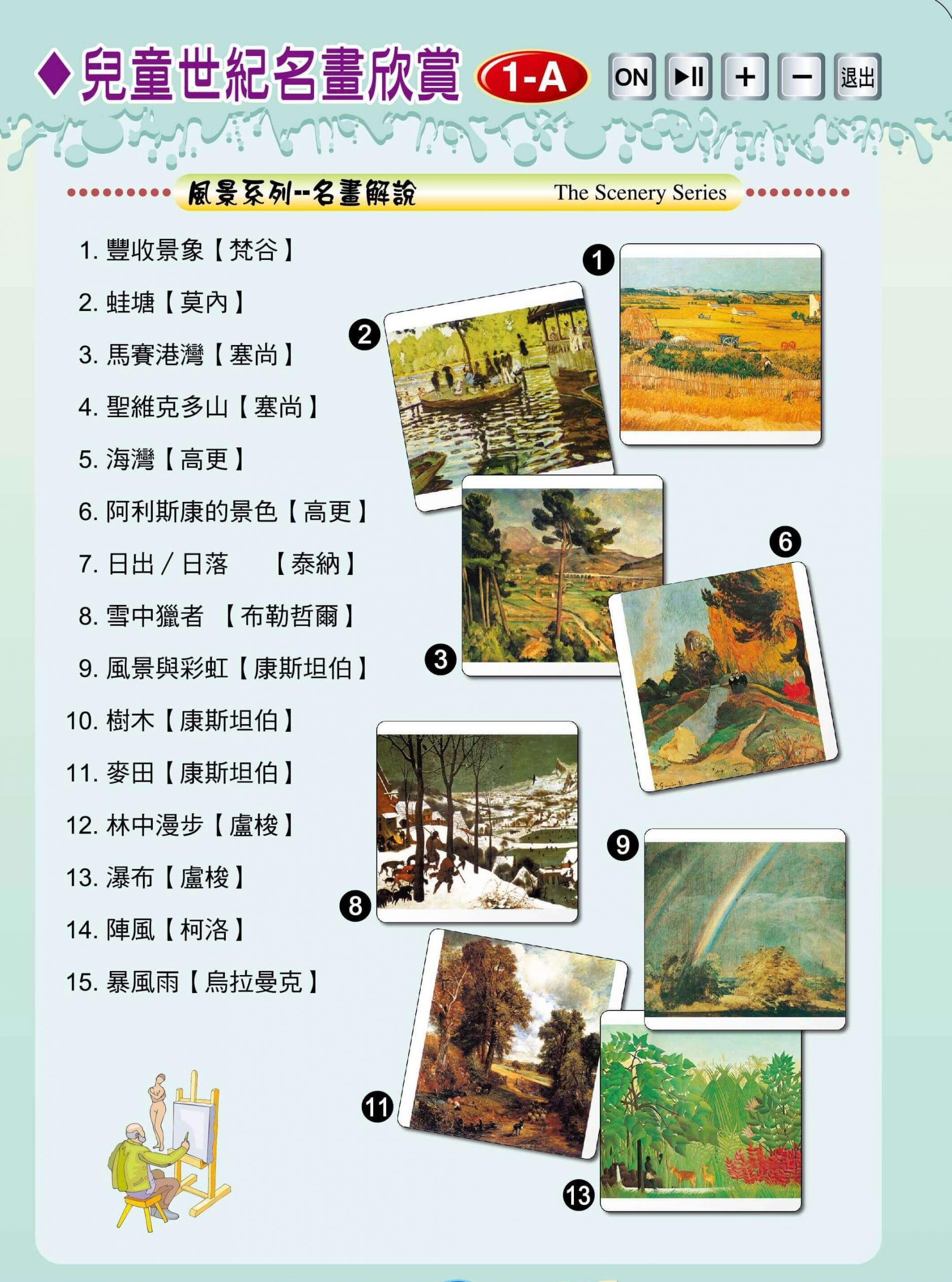 最輕鬆的資優計畫 >>> 最多元的教案主題 >>> 最簡明的教學內容 >>> 最省錢的教育投資 >>> 最科學的教育工具 >>> 最有效的教學方法 >>> 【ET-04點讀卡】 兒童世紀名畫~歡迎試聽 點擊下方 、名稱,進入閱覽 兒童世紀名畫賞析1-A(圖片點讀) 熱點顯示 / 隱藏