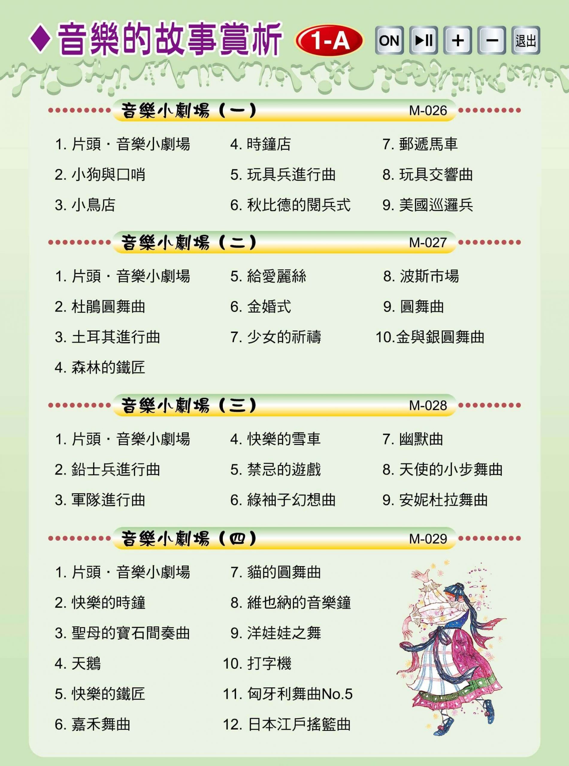 最輕鬆的資優計畫 >>> 最多元的教案主題 >>> 最簡明的教學內容 >>> 最省錢的教育投資 >>> 最科學的教育工具 >>> 最有效的教學方法 >>> 【ET-04點讀卡】 音樂小劇場~歡迎試聽 點擊下方 、名稱,進入閱覽 1-A:音樂的故事賞析(圖片點讀) 熱點顯示 / 隱藏