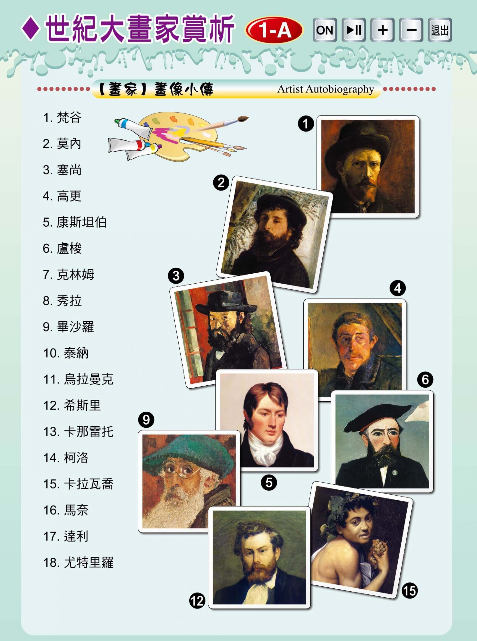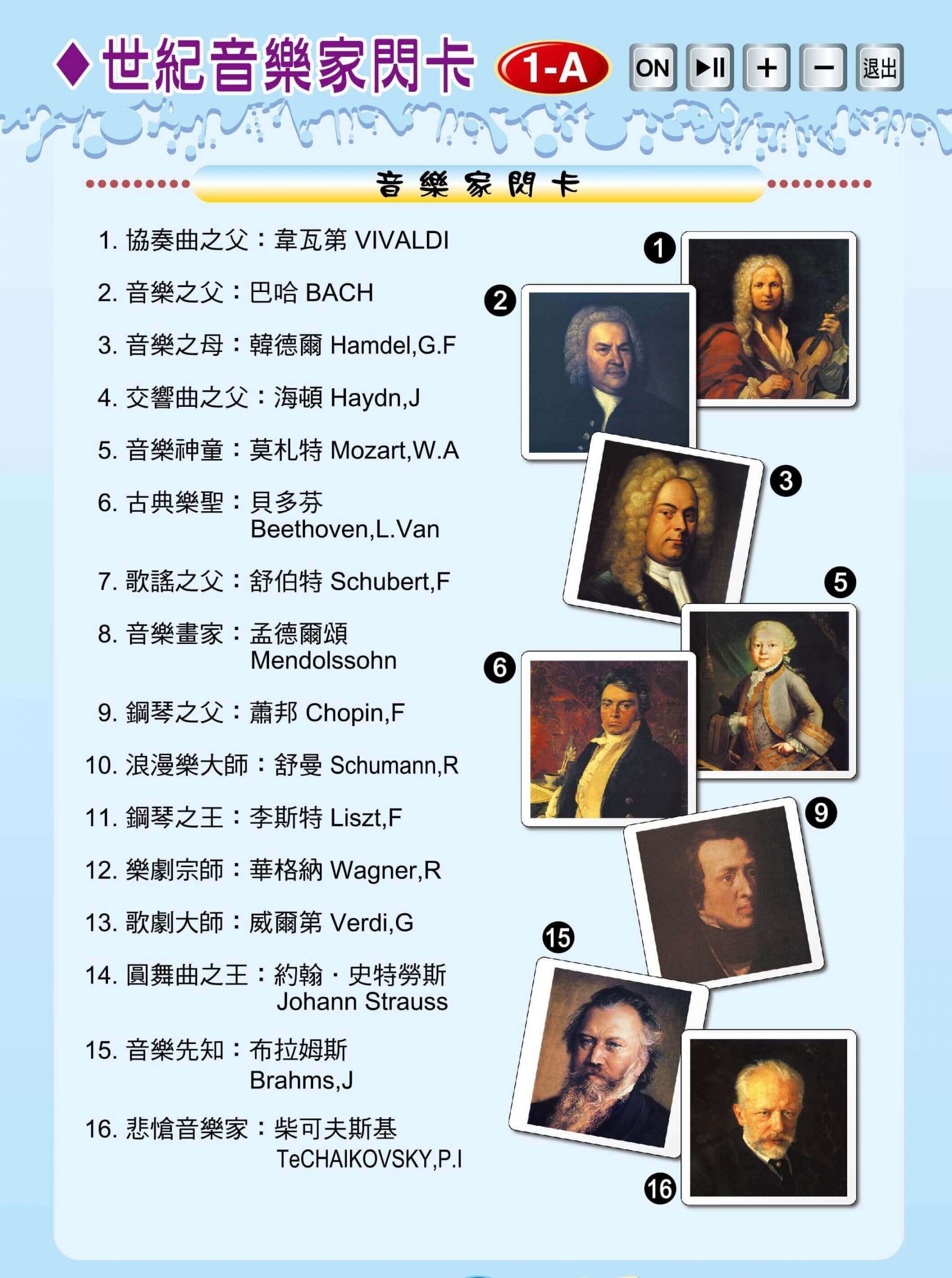 最輕鬆的資優計畫 >>> 最多元的教案主題 >>> 最簡明的教學內容 >>> 最省錢的教育投資 >>> 最科學的教育工具 >>> 最有效的教學方法 >>> 【ET-04點讀卡】 音樂藝術閃卡~歡迎試聽 點擊下方 、名稱,進入閱覽 【世紀畫家】 世紀大畫家賞析1-A(圖片點讀) 熱點顯示 / 隱藏 【世紀音樂家】 世紀音樂家閃卡1-A(圖片點讀) 熱點顯示 / 隱藏